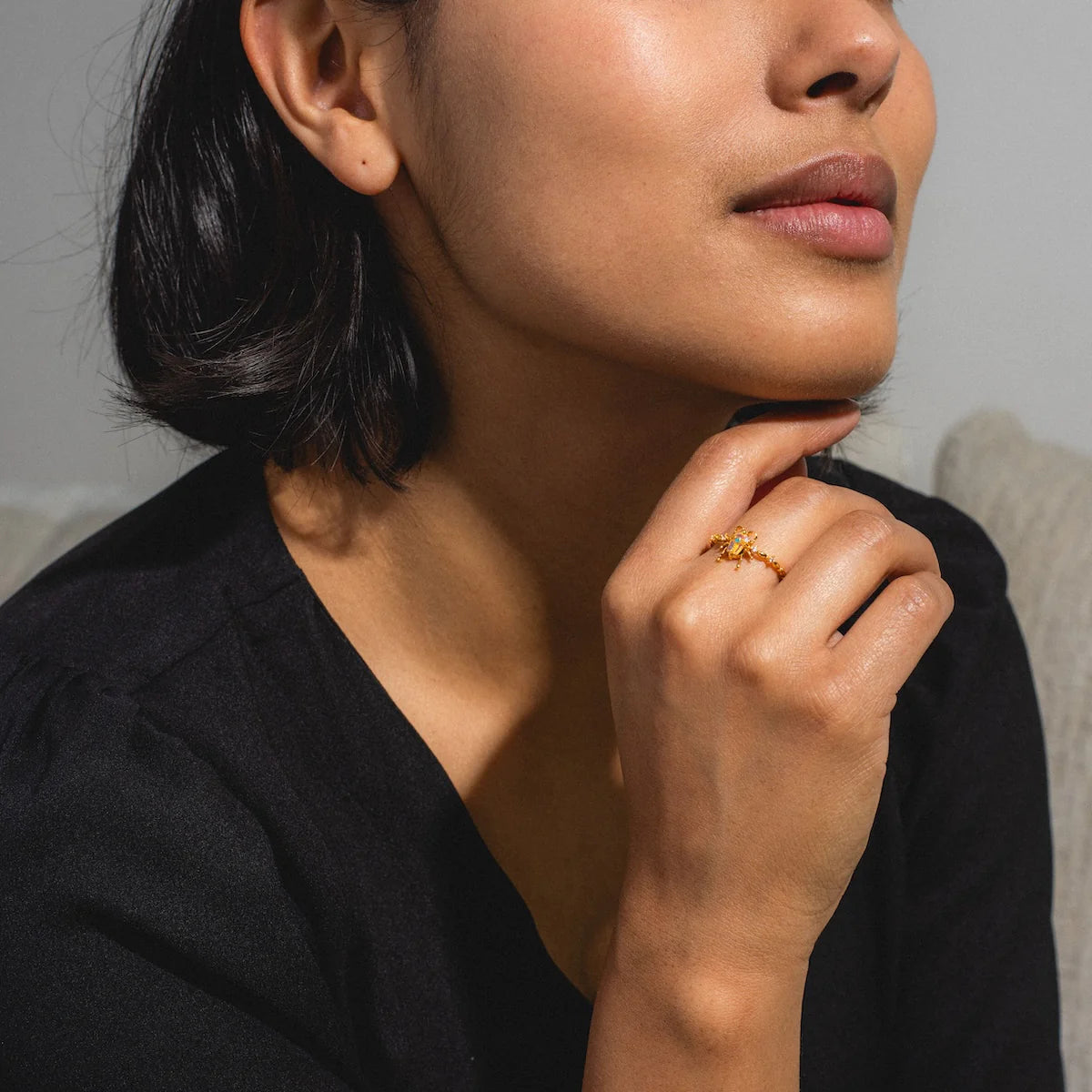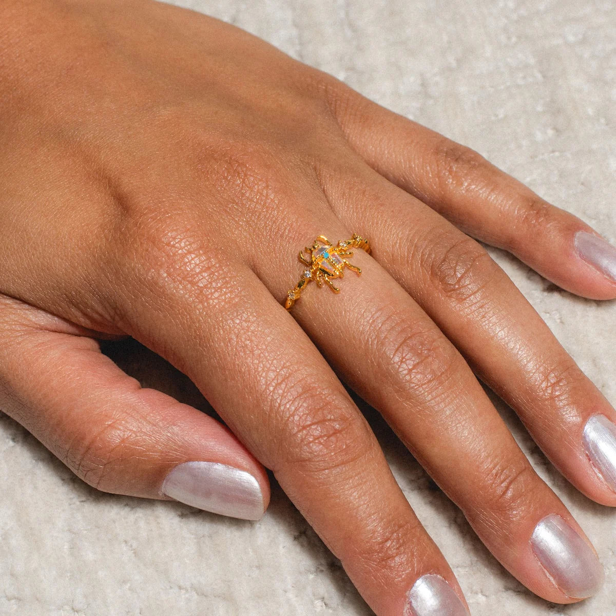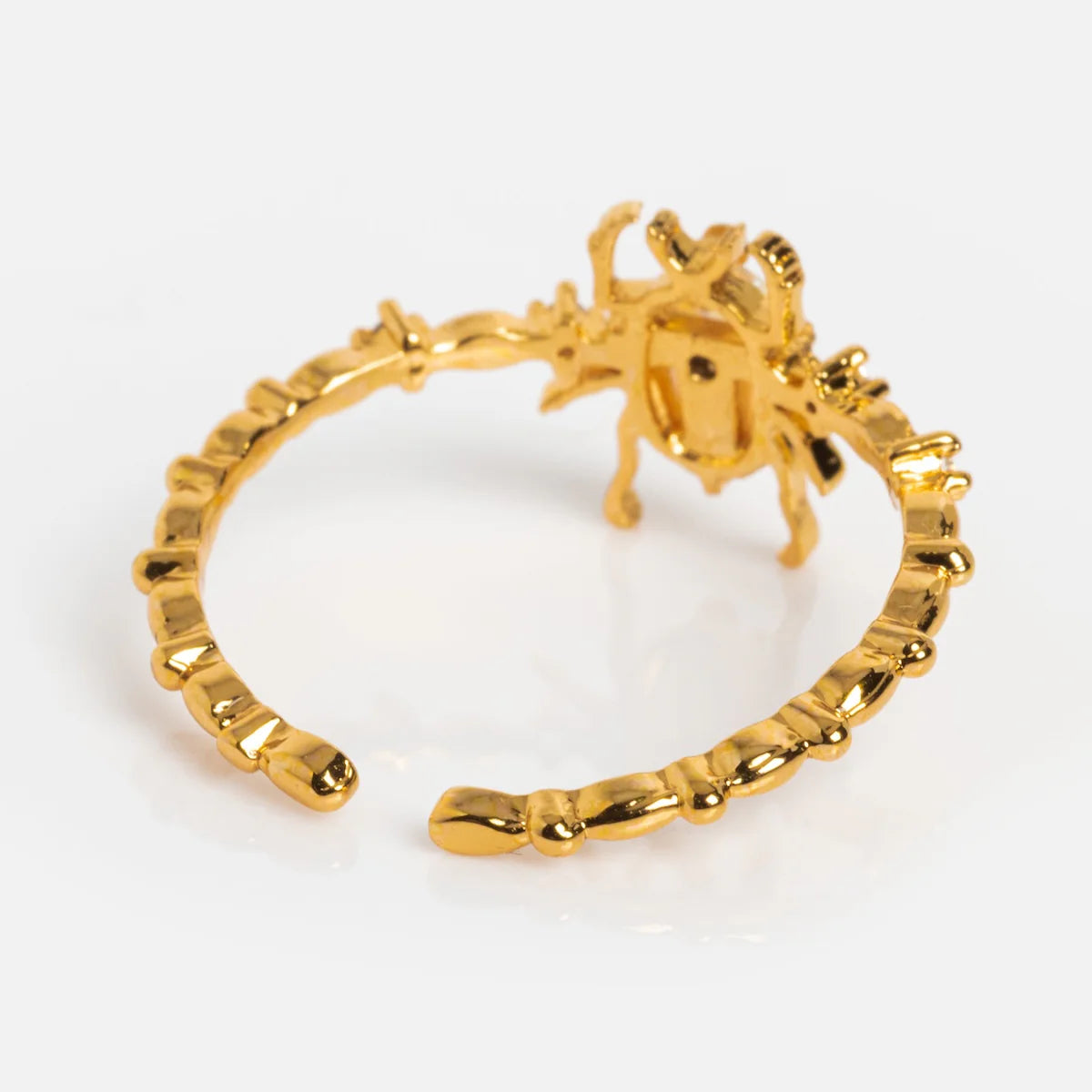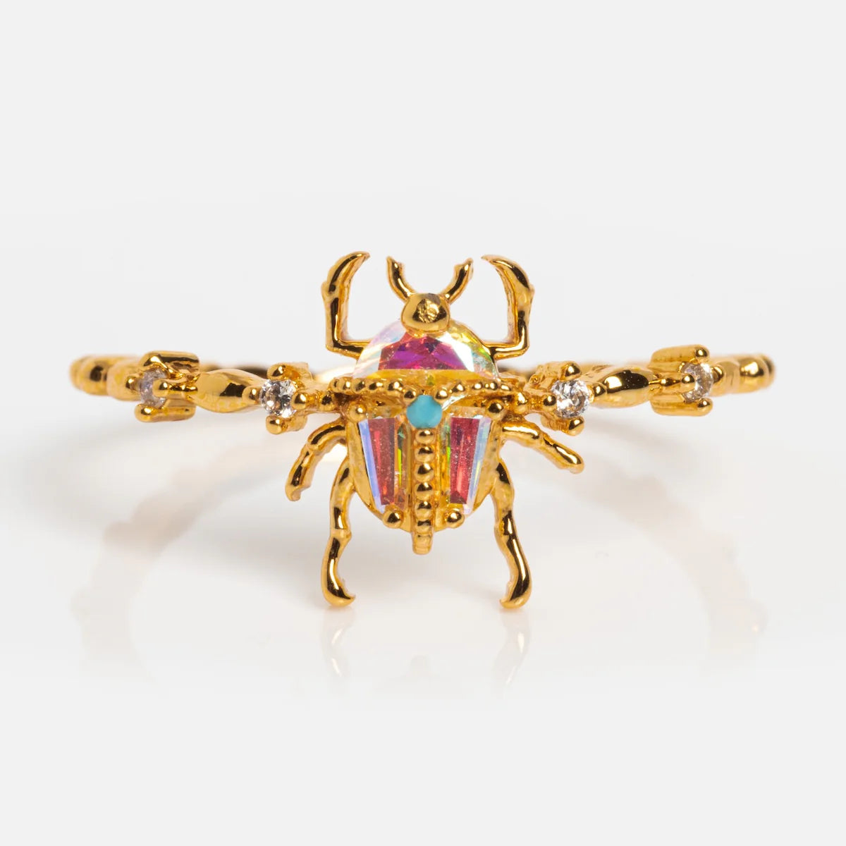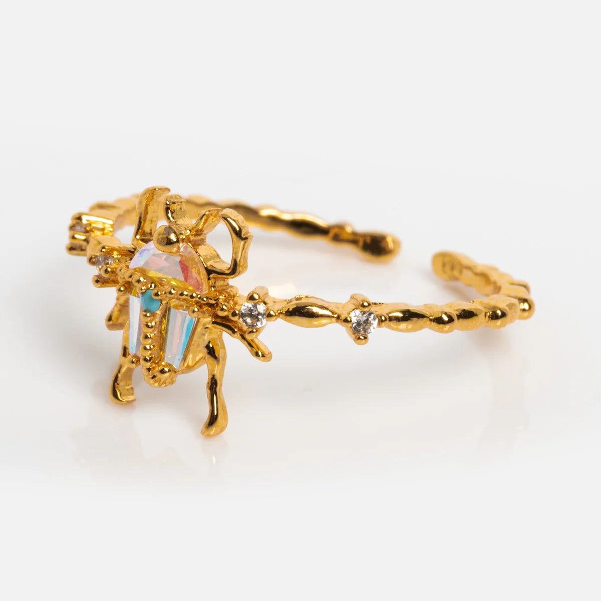 Le Design Au centre, un scarabée sculpté prend vie grâce à une pierre centrale iridescente qui change de couleur selon l'angle de la lumière, surmontée d'une petite touche turquoise. Le corps de l'insecte repose sur un anneau finement texturé, façon branche dorée, ponctué de petits cristaux scintillants de part et d'autre pour une finition joaillière.
