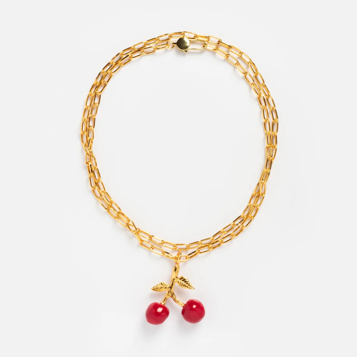Le Design Versatilité absolue. Ce bijou est un caméléon : sa longue chaîne de 86 cm permet de le porter en sautoir bohème pour allonger la silhouette, ou de la doubler pour créer un effet "choker" superposé ultra-tendance. Le pendentif, deux cerises d'un rouge profond et glossy, est suspendu à une tige texturée en or, créant un contraste saisissant entre la brillance de la résine et la chaleur du métal.
