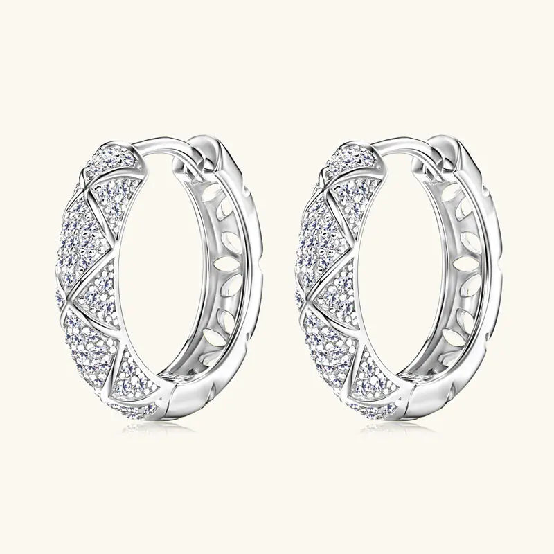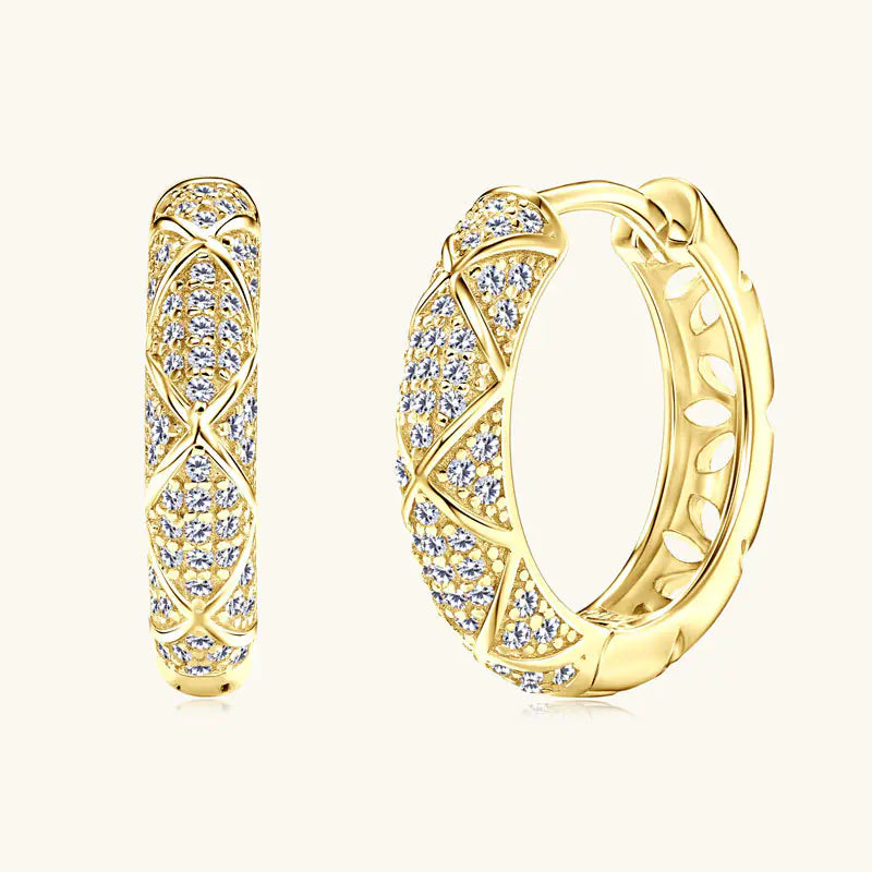Capturez la lumière à chaque mouvement avec ces mini-créoles (huggies) au design matelassé intemporel. Leur motif croisillon, entièrement pavé de pierres scintillantes, offre un équilibre parfait entre détails artistiques et simplicité raffinée.